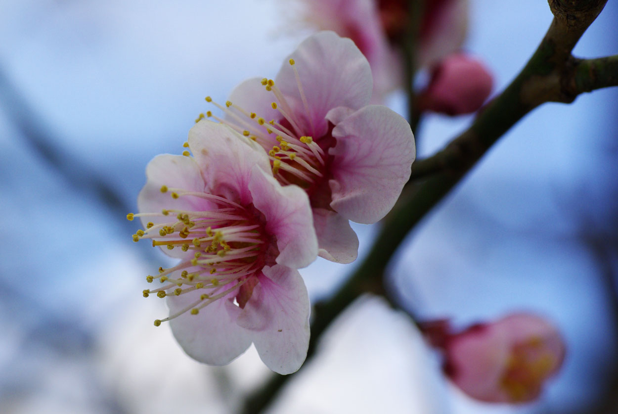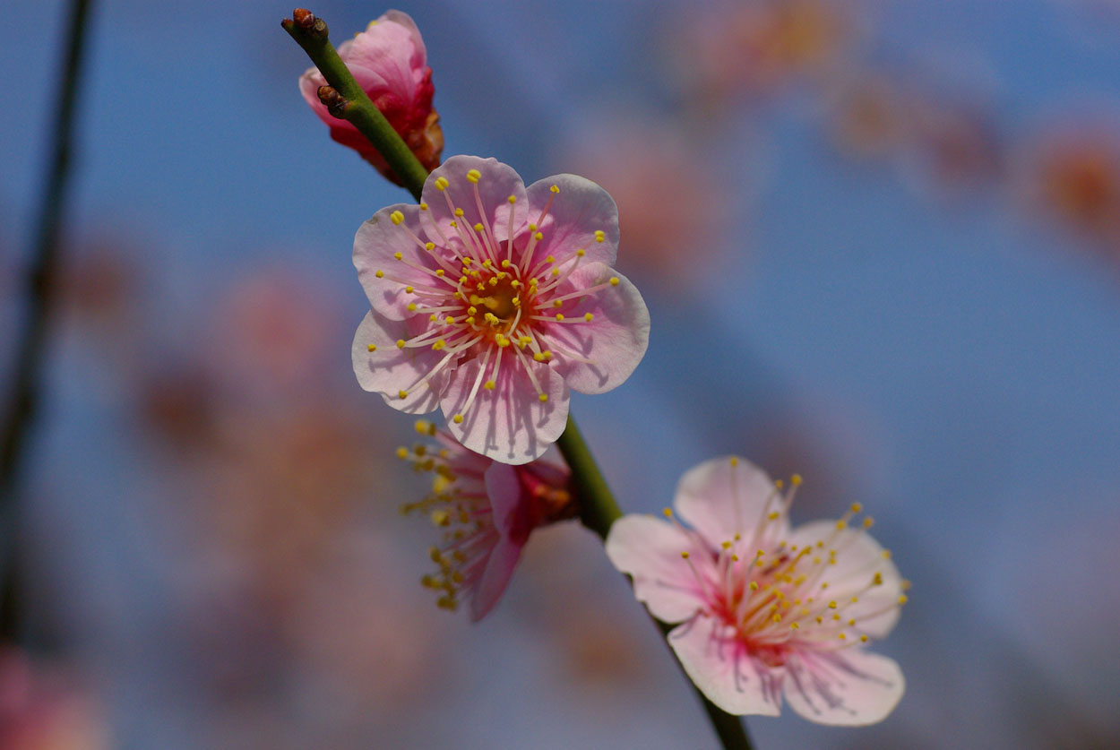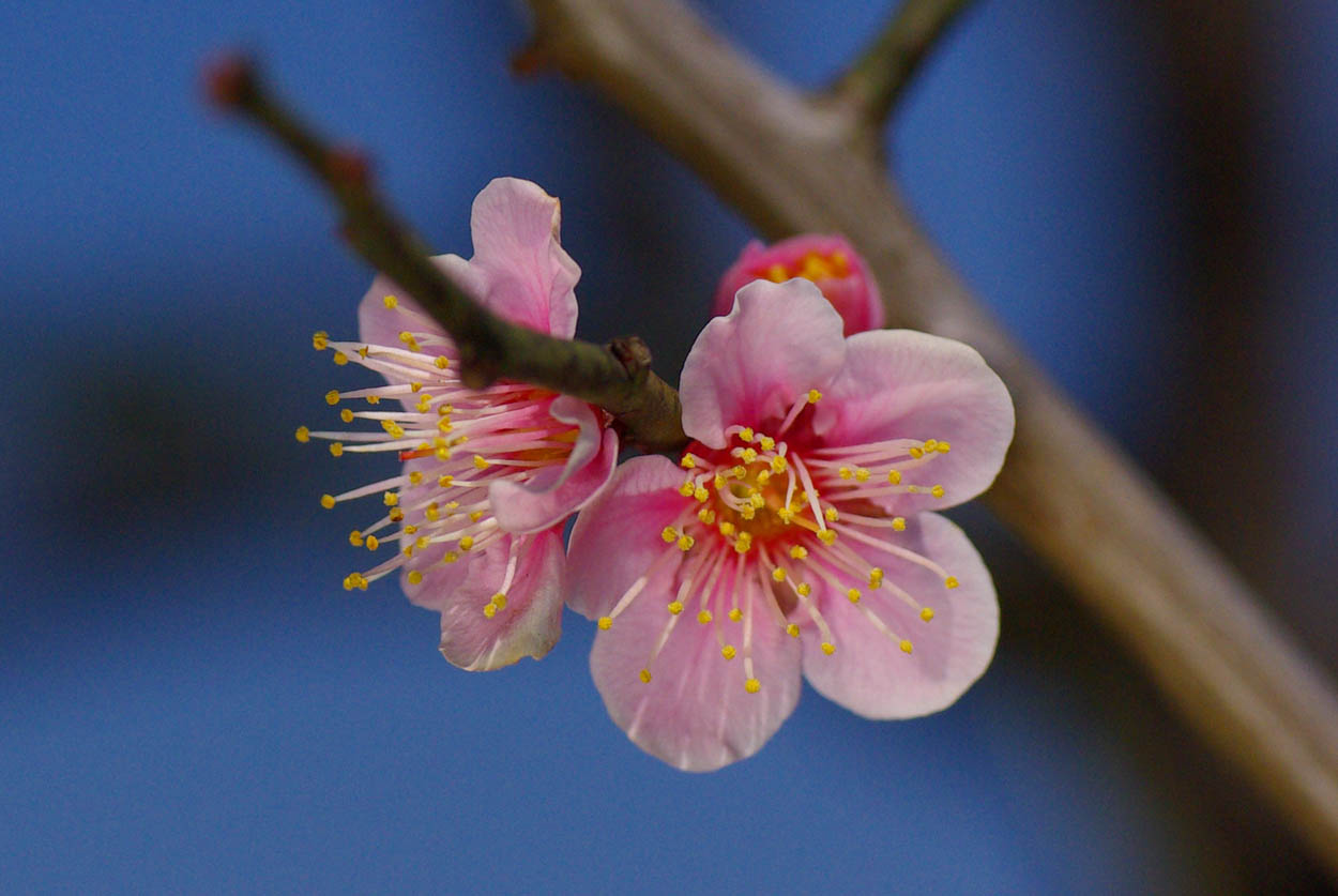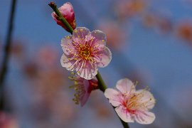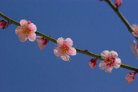 今日は日本晴れの好天気です。青空を背景に薄紅色の梅を撮りました。