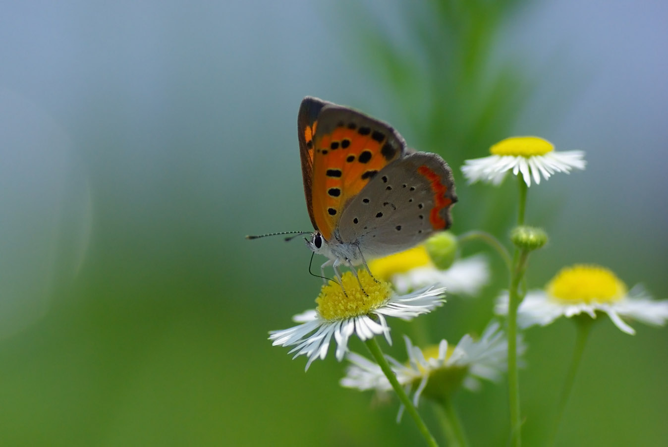 帰り道、道端のヒメジョオンに綺麗な蝶が止まって蜜を吸っているのを見つけました。