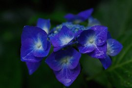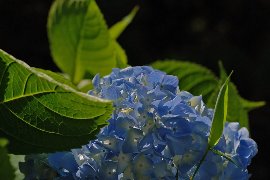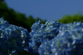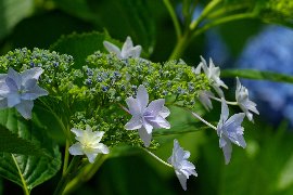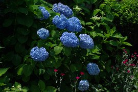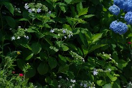 | 西洋アジサイ(中央:青) と額アジサイ(右上:白)