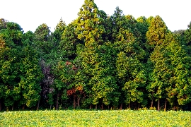 | 174.晩秋の夕陽を浴びる杉(?)林