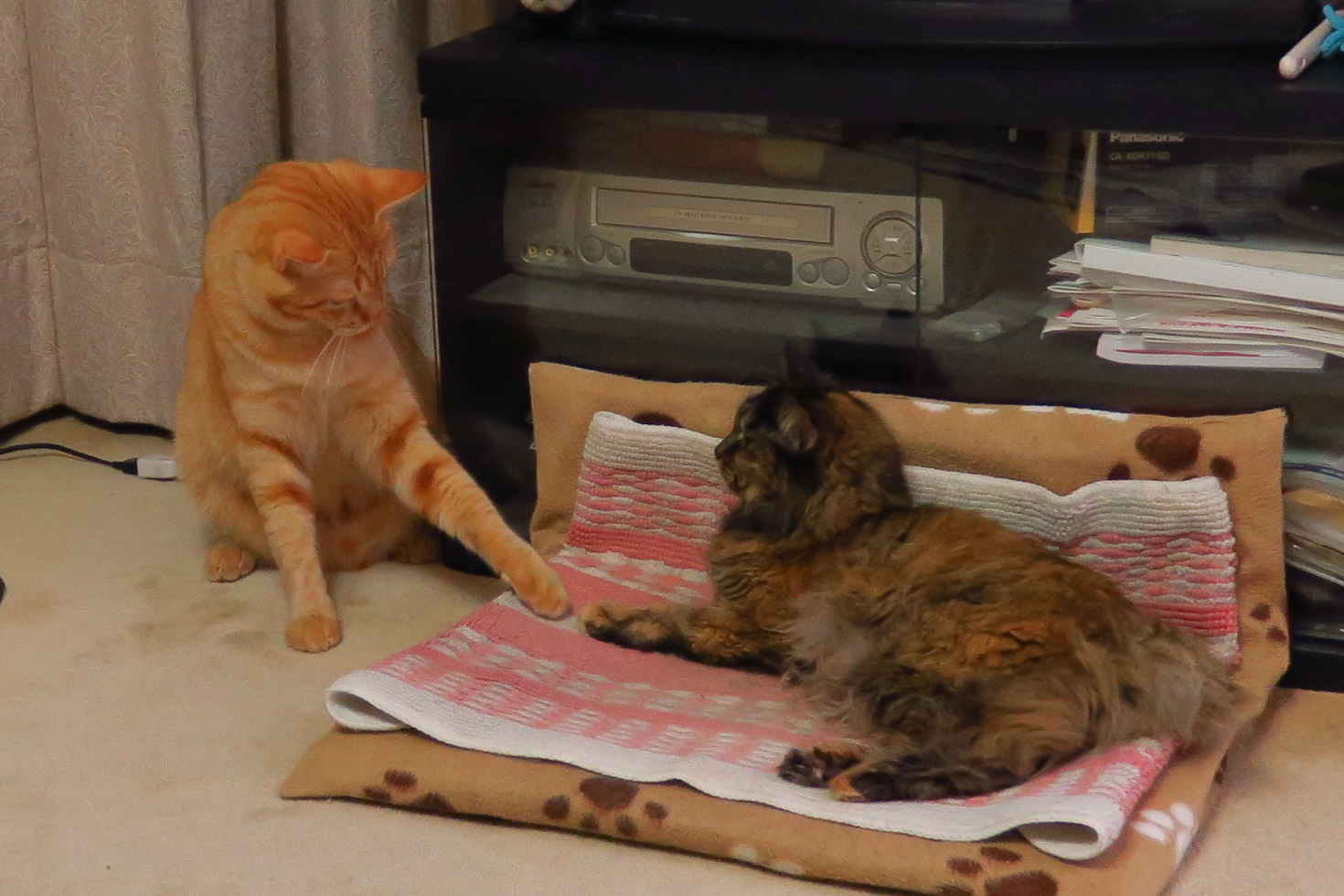8月末、茶々(奥)とミーコ(手前)の体重を測定したところ、茶々は堂々の